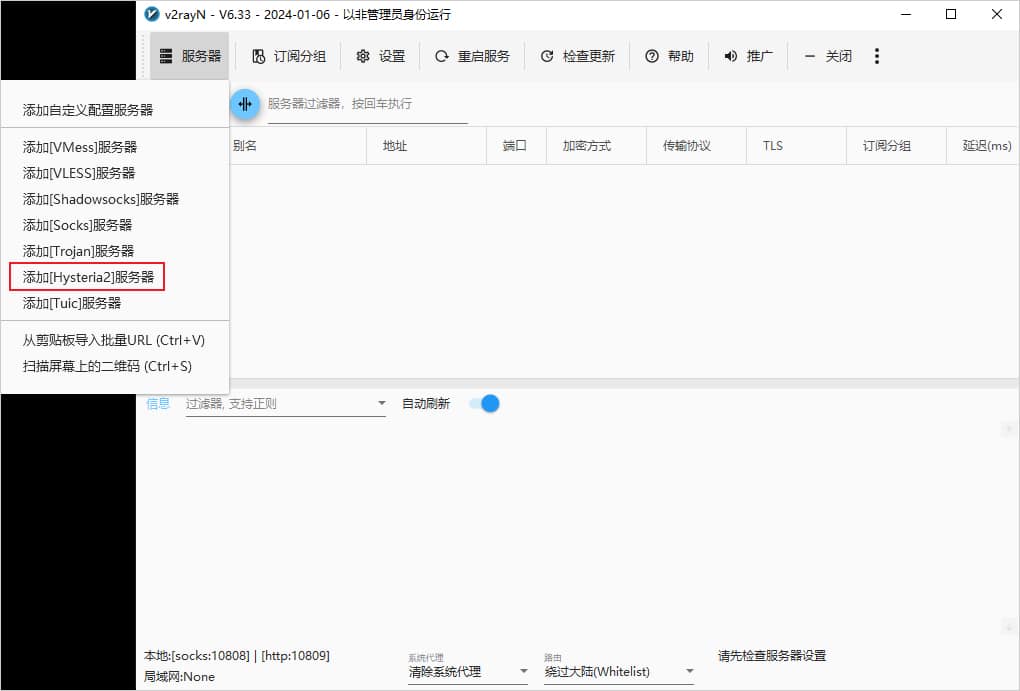 点击软件主界面的服务器,选择 添加[Hysteria2]服务器,如下图所示。