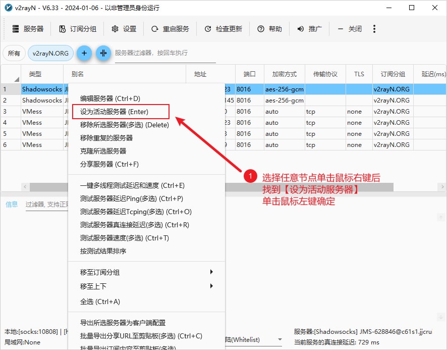 在软件主界面选择任意节点,单击鼠标右键,在弹出的窗口中扎到设为活动服务器即可选择节点,如下图所示,然后开启系统代理即可,也可以选择任意节点,双击鼠标左键选择节点。